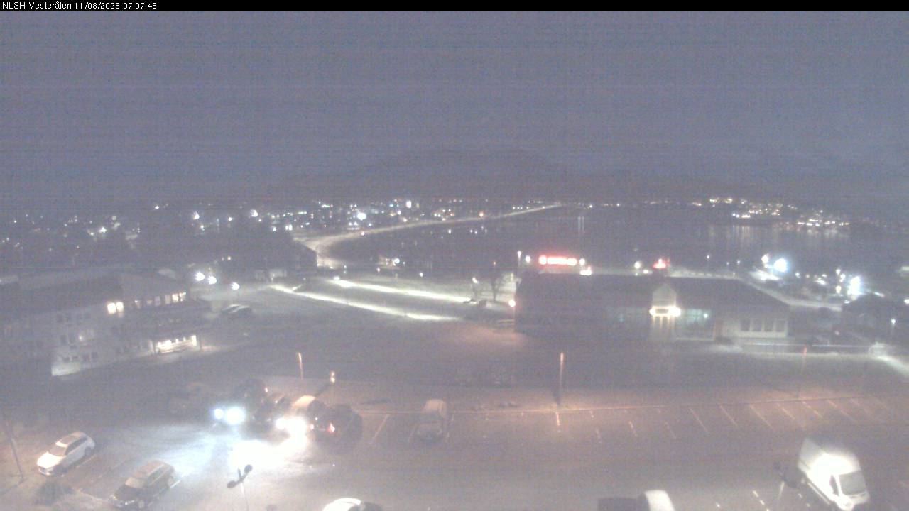 - oppdateres hvert minutt. Utsikt over Stokmarknes, sykehusbukta, sentrum og Børøybrua med fjelltoppen Hallartinden i bakgrunnen.